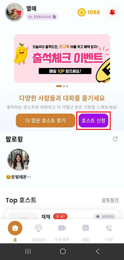 ② 망고톡 첫 화면에 [호스트 신청] 버튼을 눌러 주세요.