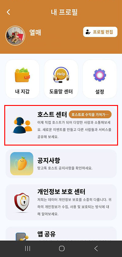 망고톡 앱에서는 호스트로 등록하면